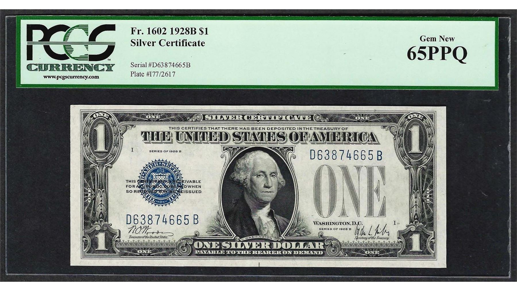 One 1928B $1 Funnyback Silver Certificate Note Fr.1602 PCGS Gem New 65PPQ. PCGS Graded.