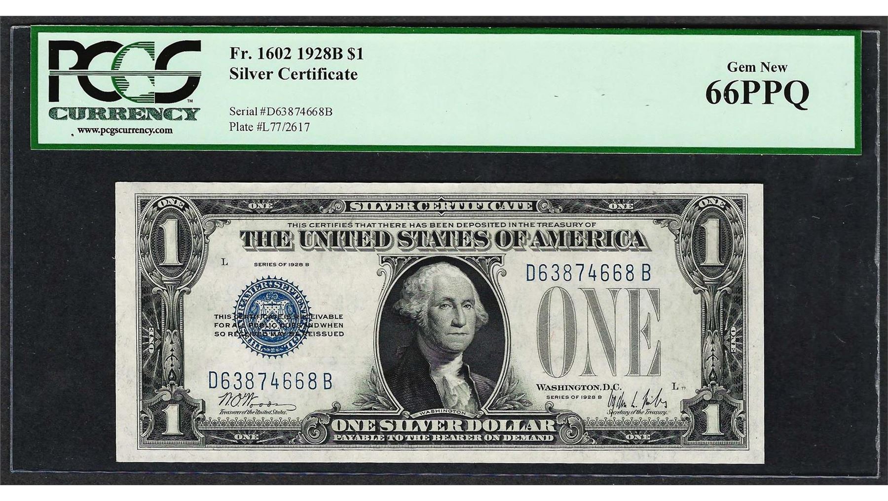 One 1928B $1 Funnyback Silver Certificate Note Fr.1602 PCGS Gem New 66PPQ. PCGS Graded.