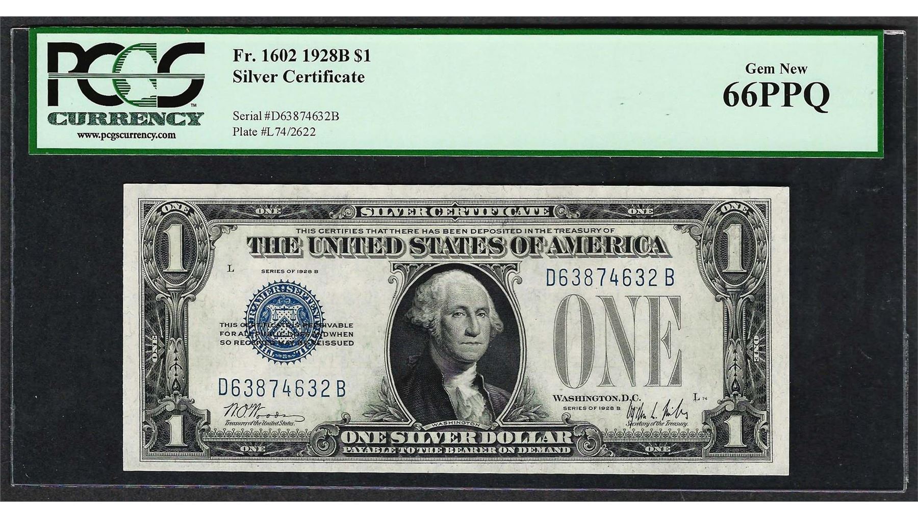 One 1928B $1 Funnyback Silver Certificate Note Fr.1602 PCGS Gem New 66PPQ. PCGS Graded.