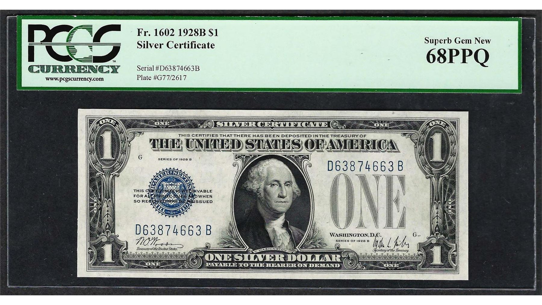 One 1928B $1 Funnyback Silver Certificate Note Fr.1602 PCGS Superb Gem New 68PPQ. PCGS Graded.