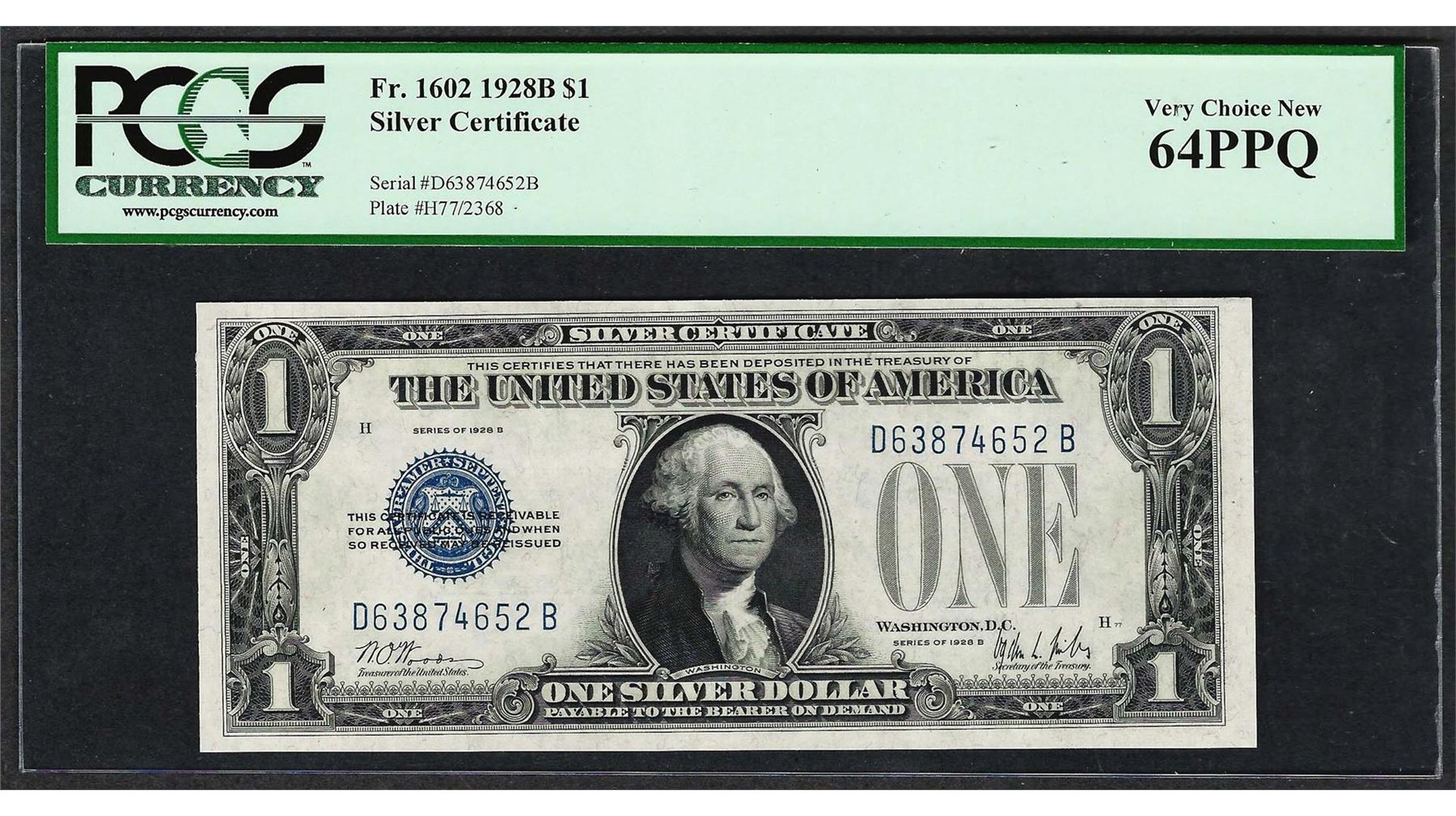 One 1928B $1 Funnyback Silver Certificate Note Fr.1602 PCGS Very Choice New 64PPQ. PCGS Graded.