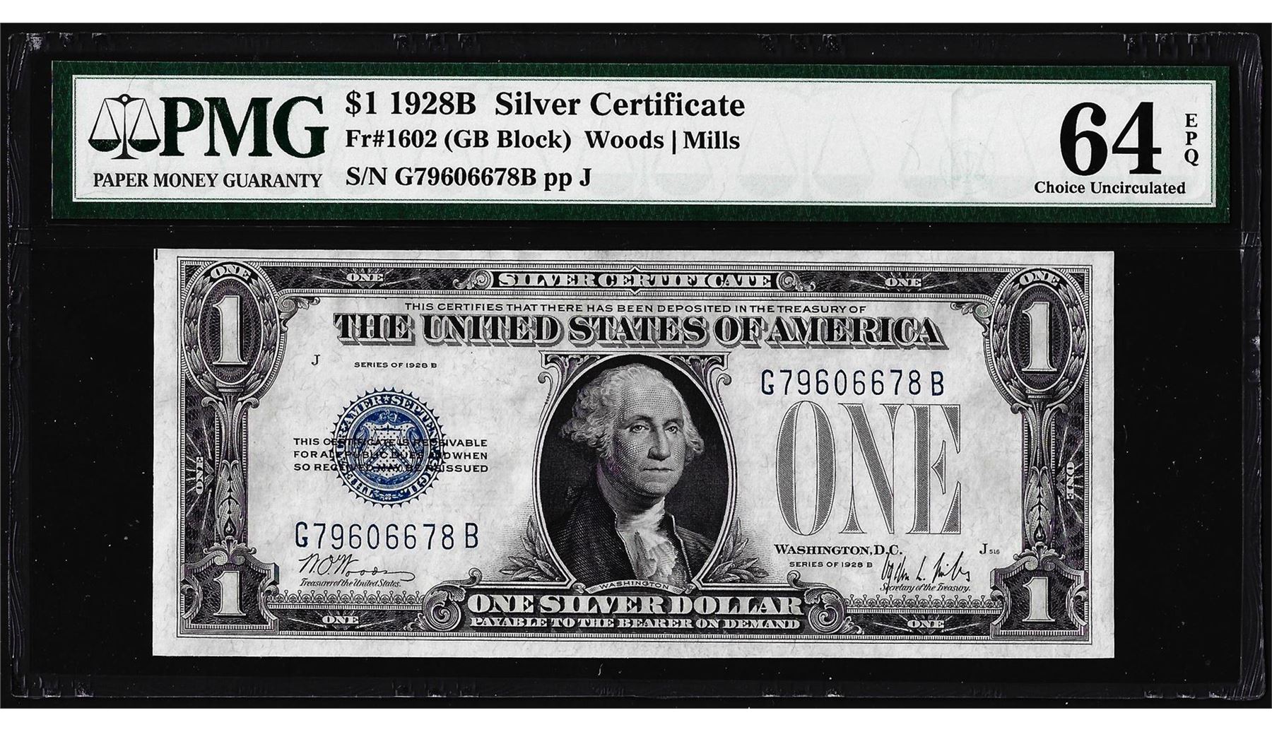 One 1928B $1 Funnyback Silver Certificate Note Fr.1602 PMG Choice Uncirculated 64EPQ. PMG Certified.