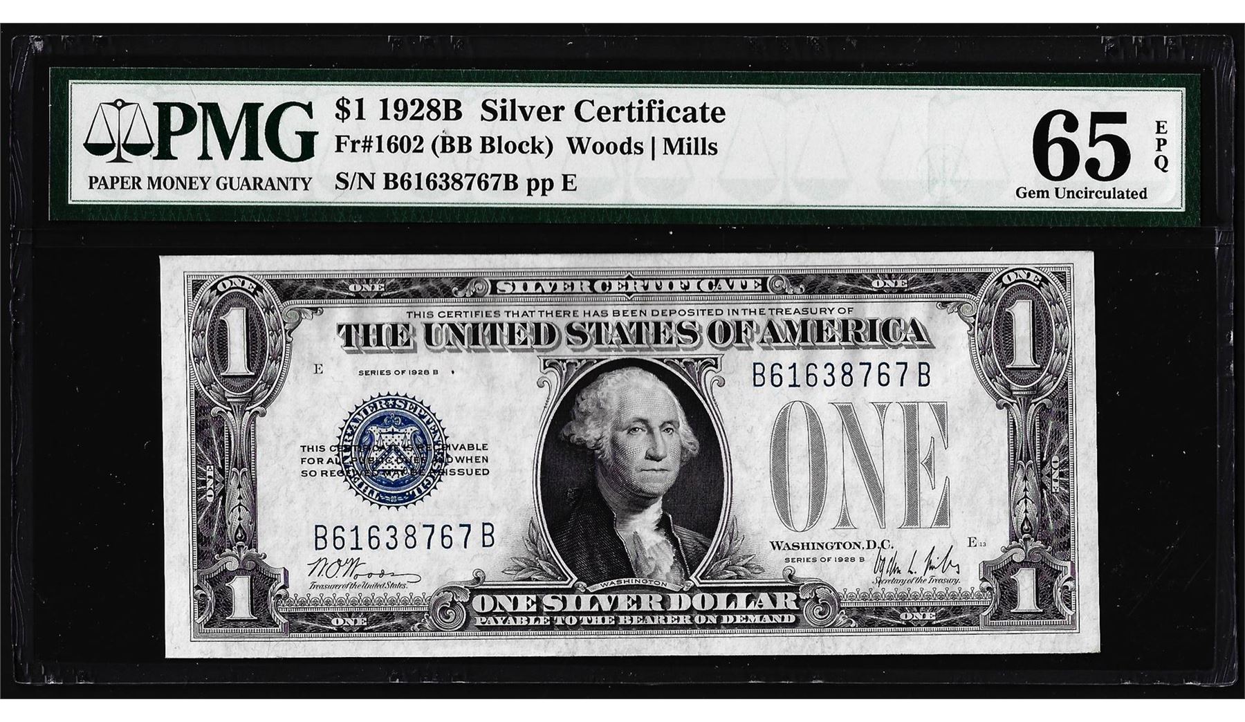 One 1928B $1 Funnyback Silver Certificate Note Fr.1602 PMG Gem Uncirculated 65EPQ. PMG Certified.