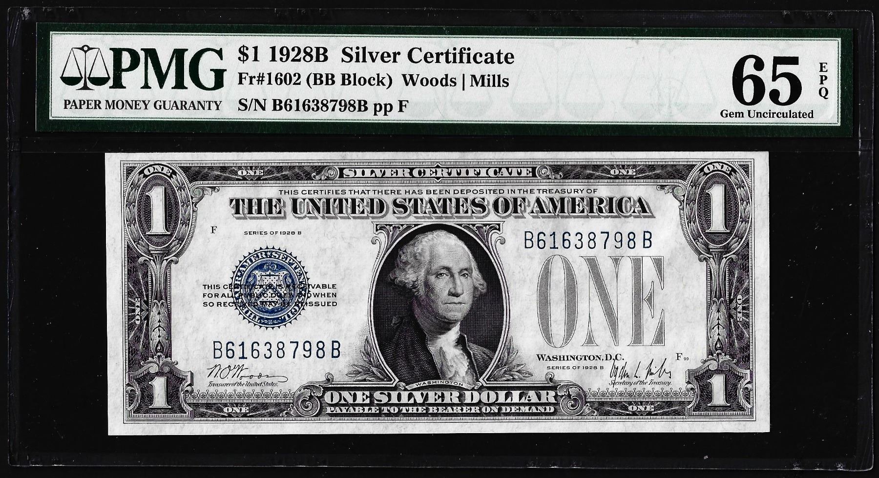 One 1928B $1 Funnyback Silver Certificate Note Fr.1602 PMG Gem Uncirculated 65EPQ.