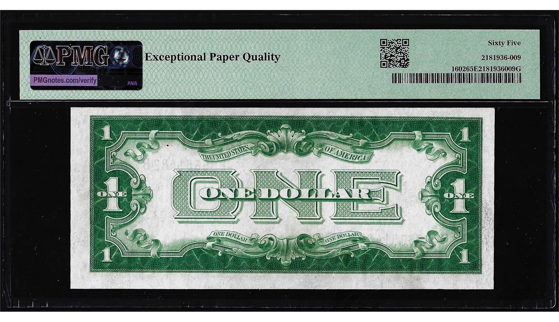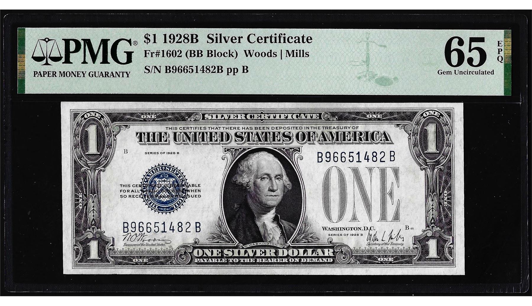One 1928B $1 Funnyback Silver Certificate Note Fr.1602 PMG Gem Uncirculated 65EPQ. PMG Certified.