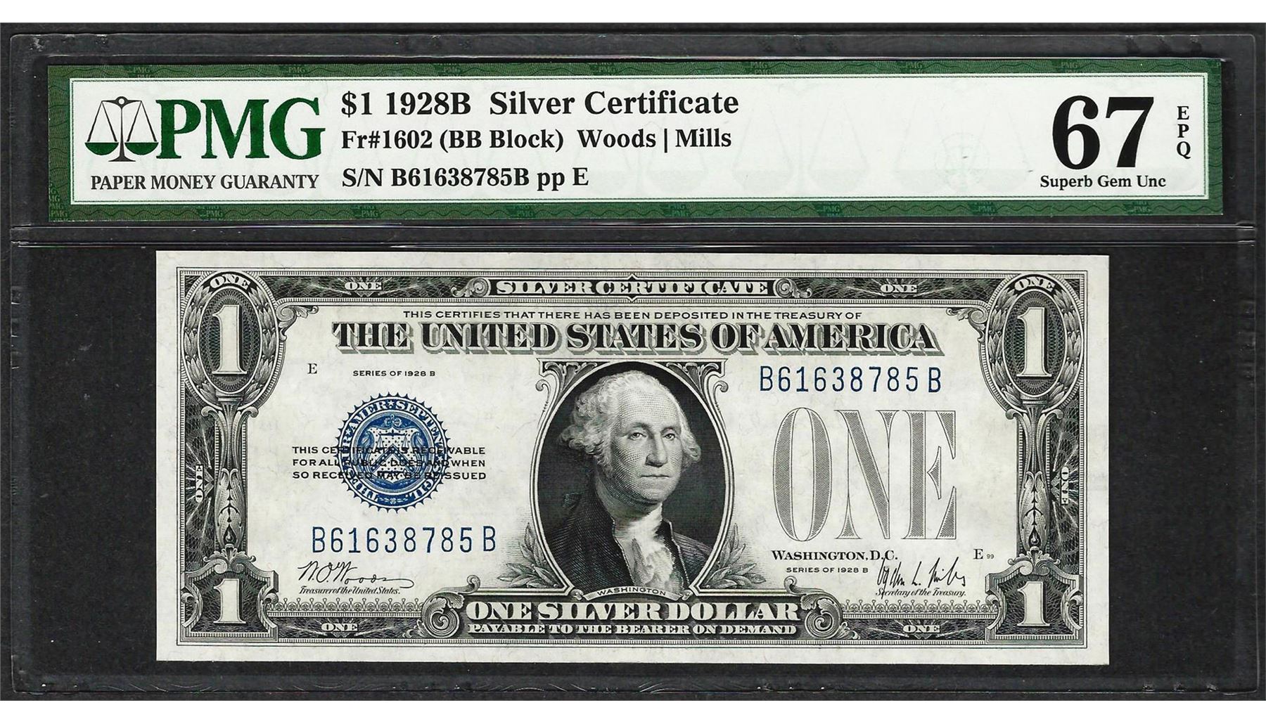 One 1928B $1 Funnyback Silver Certificate Note Fr.1602 PMG Superb Gem Uncirculated 67EPQ. PMG Certified.
