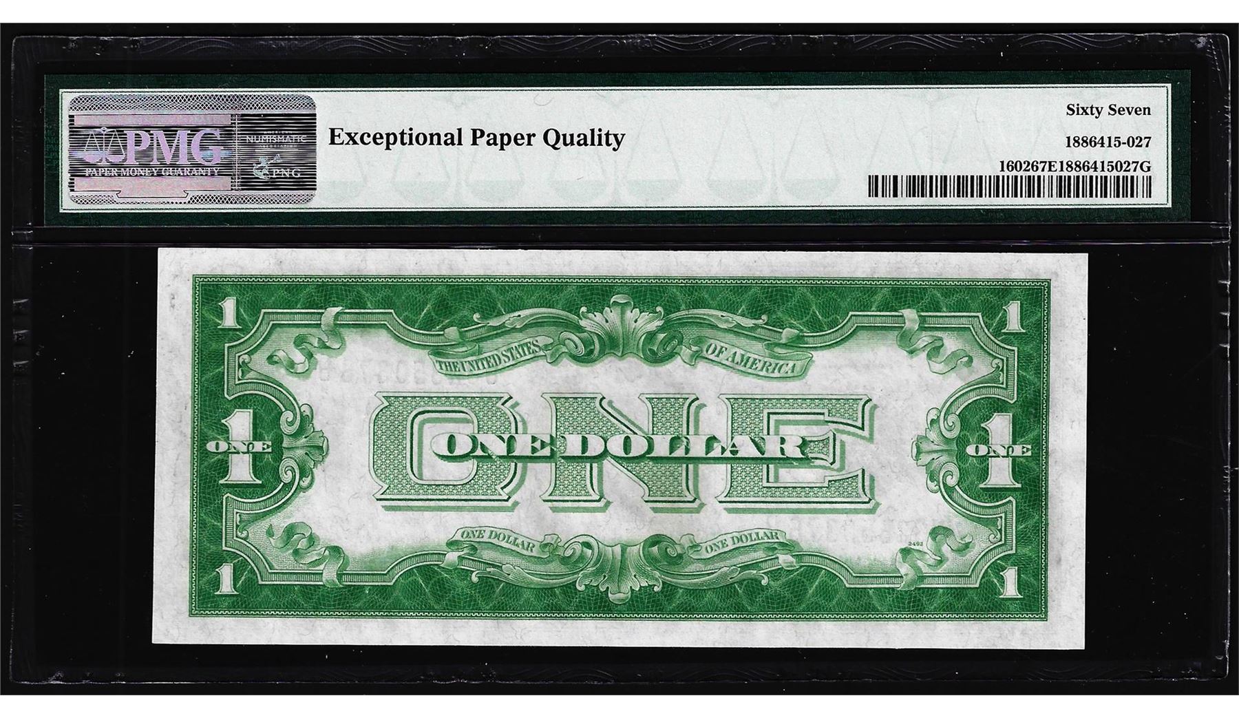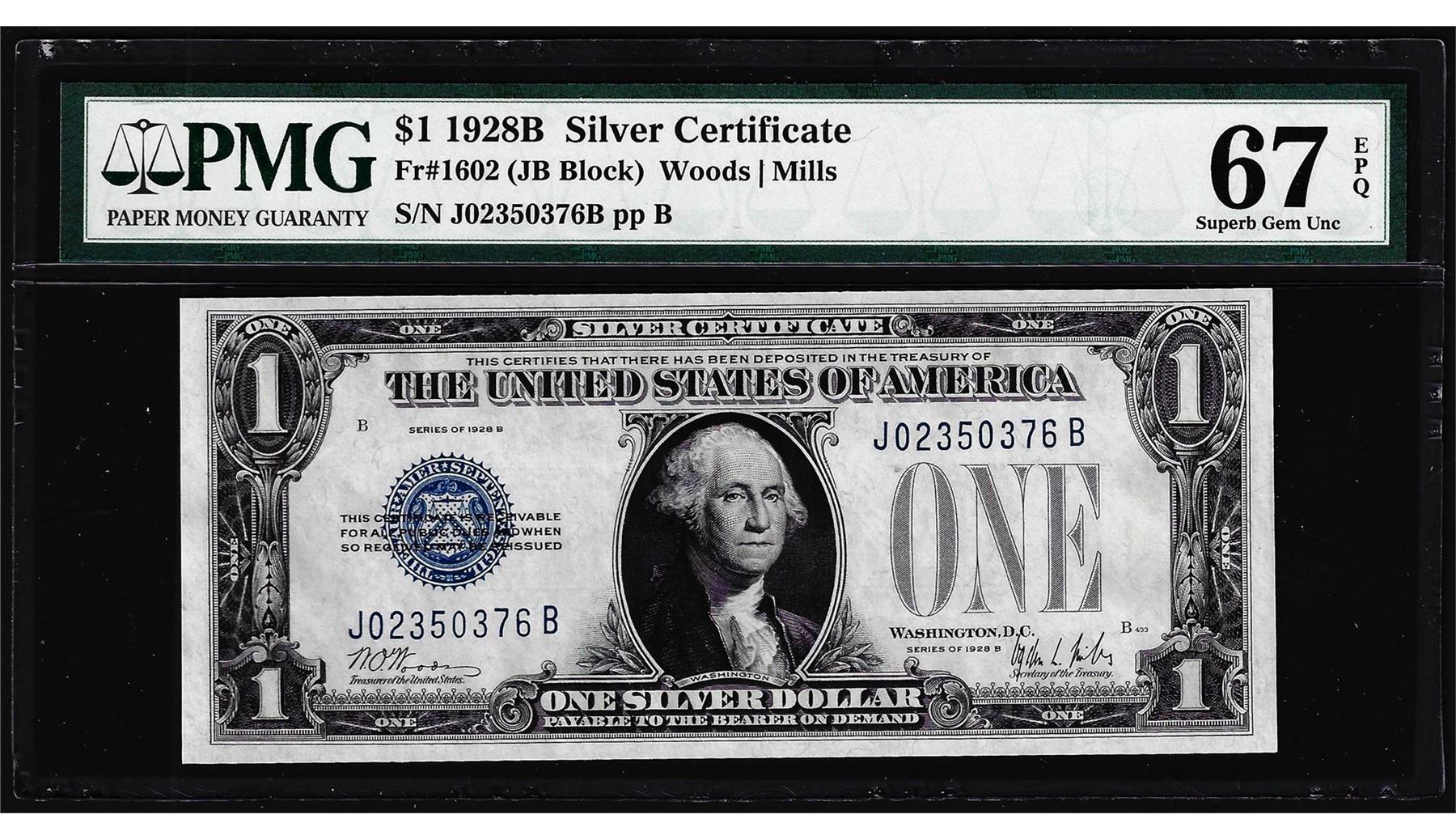 One 1928B $1 Funnyback Silver Certificate Note Fr.1602 PMG Superb Gem Uncirculated 67EPQ. PMG Certified.