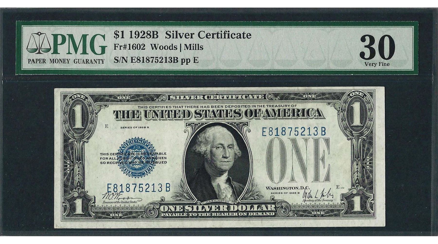 One 1928B $1 Funnyback Silver Certificate Note Fr.1602 PMG Very Fine 30. PMG Certified.