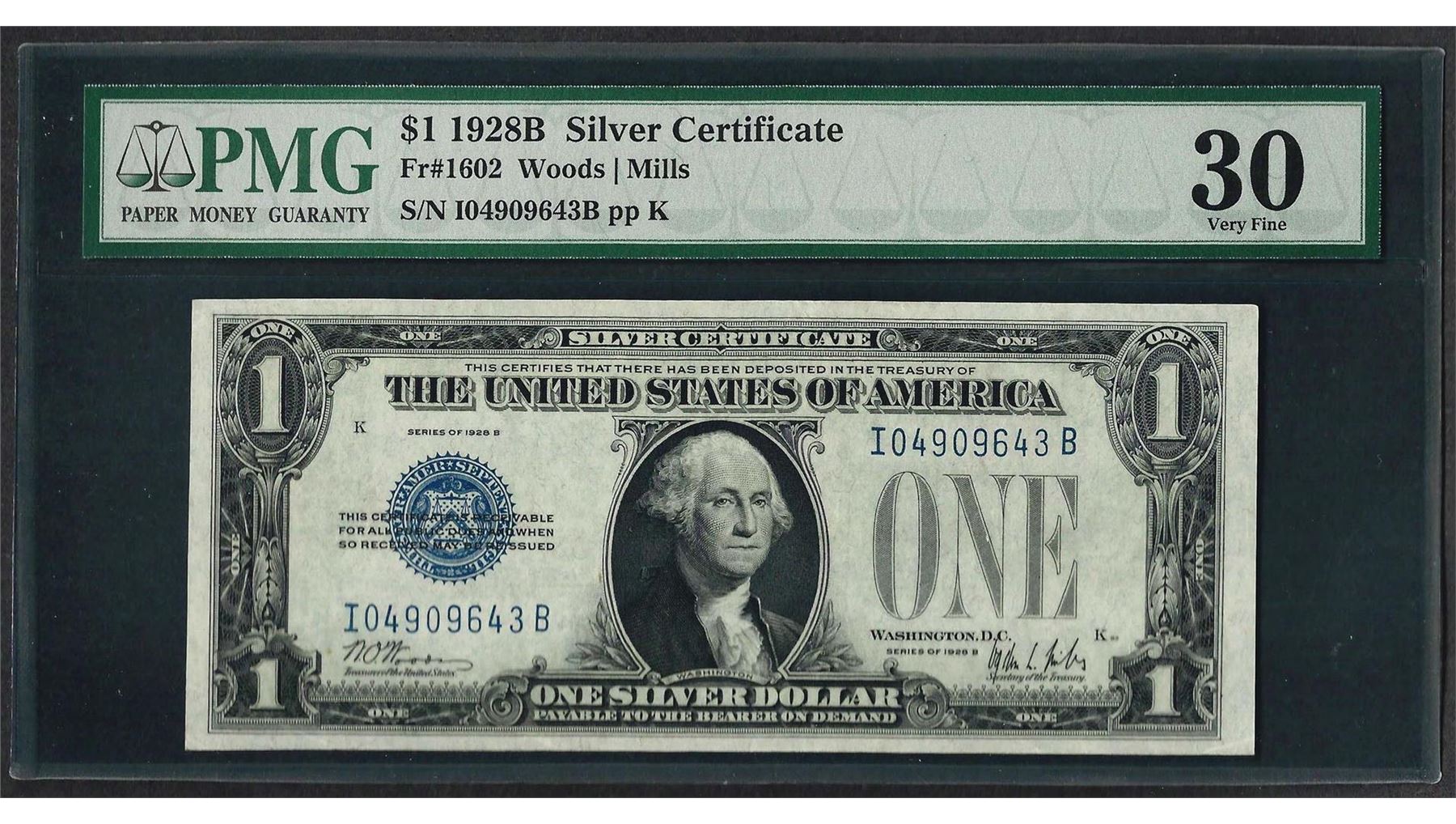 One 1928B $1 Funnyback Silver Certificate Note Fr.1602 PMG Very Fine 30. PMG Certified.