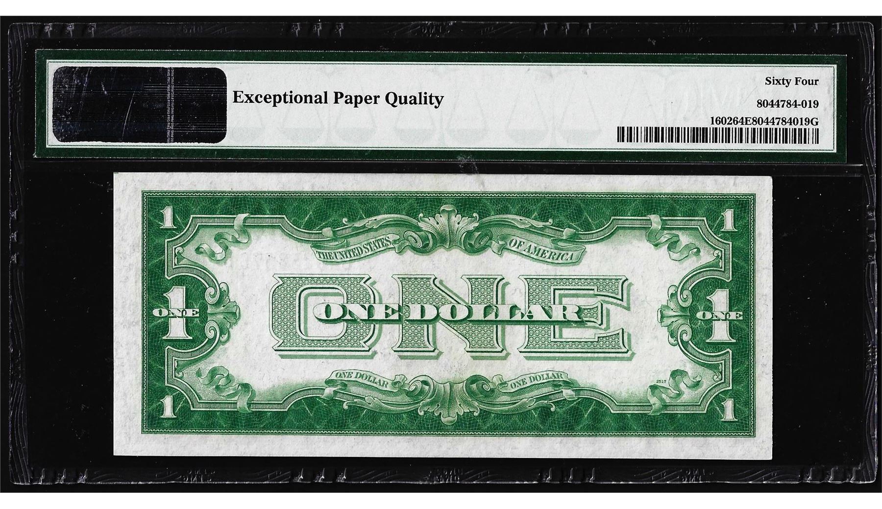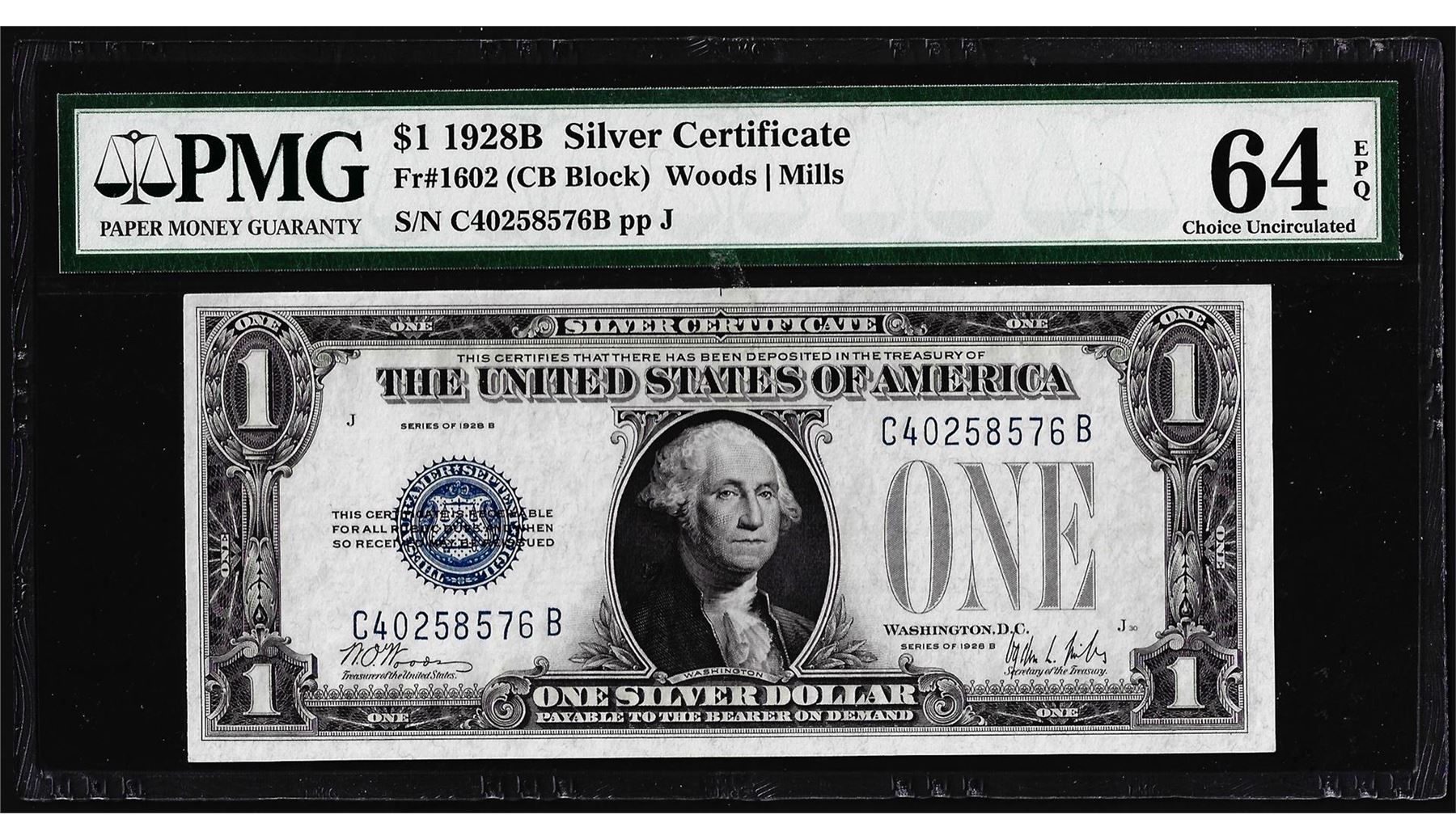 One 1928B $1 Funnyback Silver Certificate Note PMG Choice Uncirculated 64EPQ. PMG Certified.