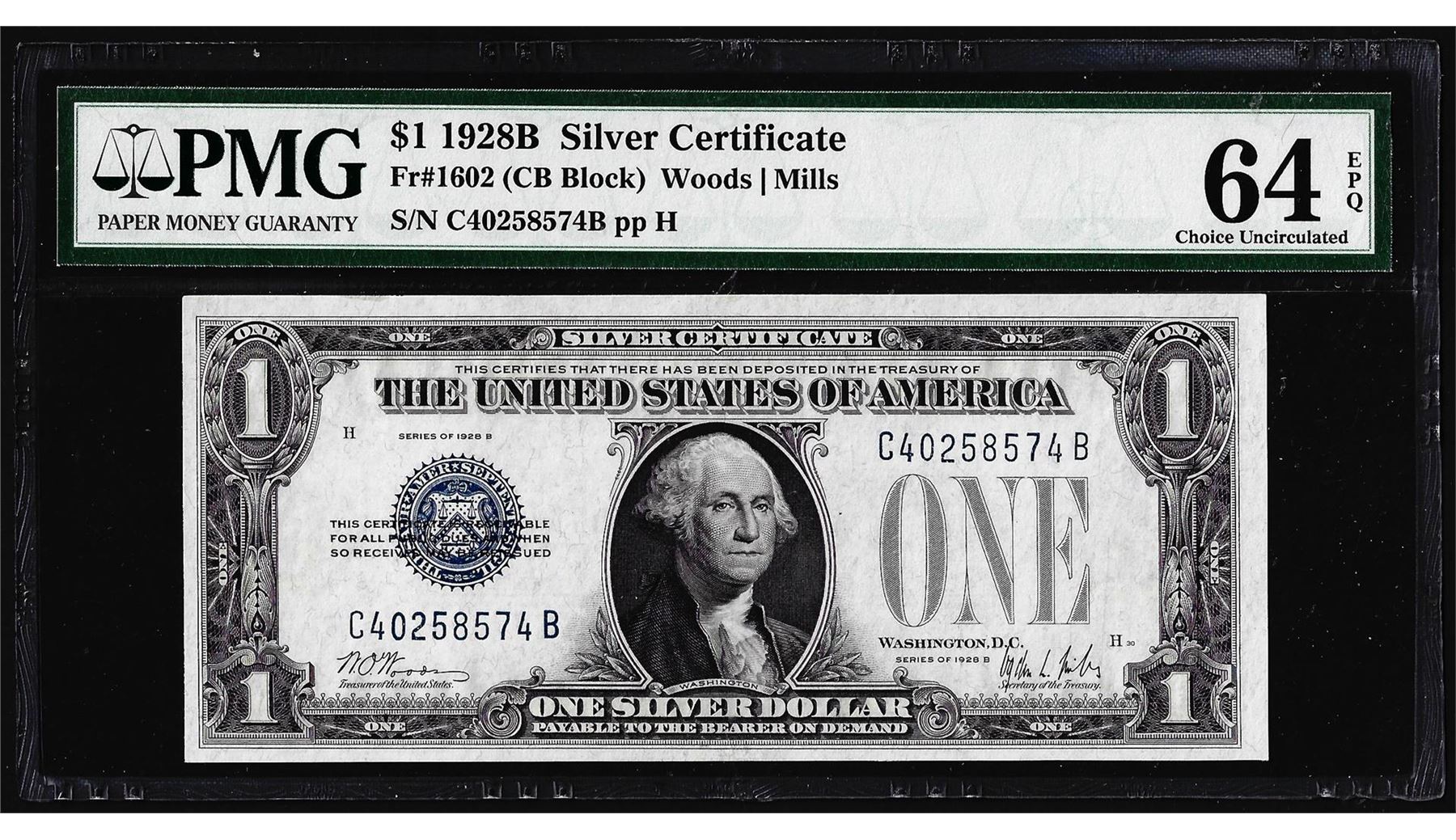 One 1928B $1 Funnyback Silver Certificate Note PMG Choice Uncirculated 64EPQ. PMG Certified.