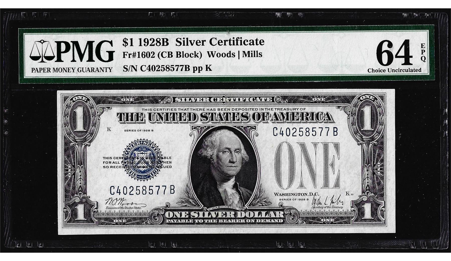 One 1928B $1 Funnyback Silver Certificate Note PMG Choice Uncirculated 64EPQ. PMG Certified.
