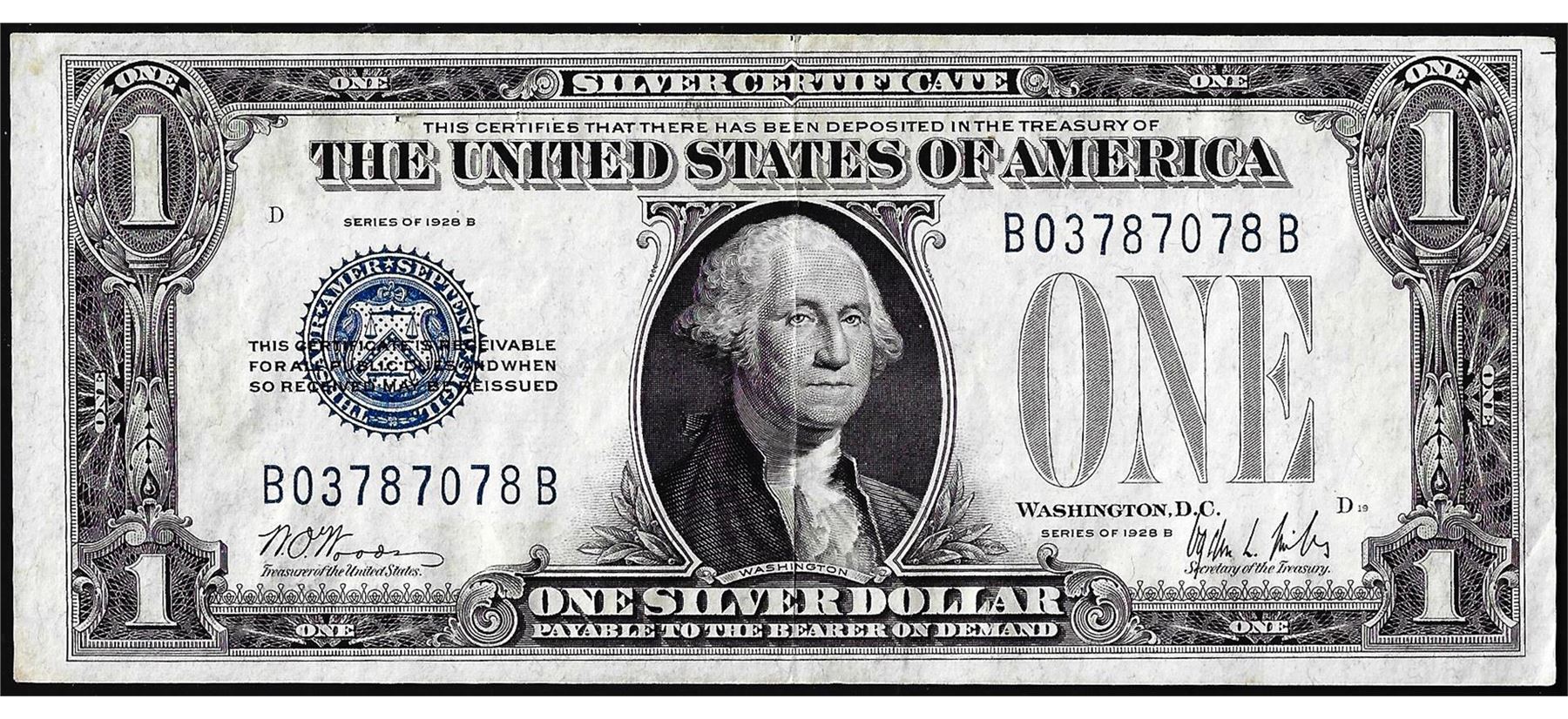 One 1928B $1 Funnyback Silver Certificate Note.