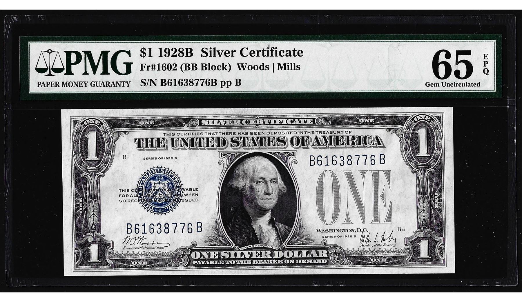 One 1928B $1 Silver Certificate Note Fr.1602 PMG Gem Uncirculated 65EPQ. PMG Certified.