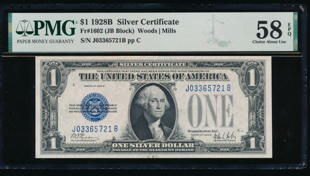 One 1928B $1 Silver Certificate PMG 58EPQ.