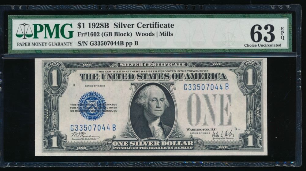 One 1928B $1 Silver Certificate PMG 63EPQ.