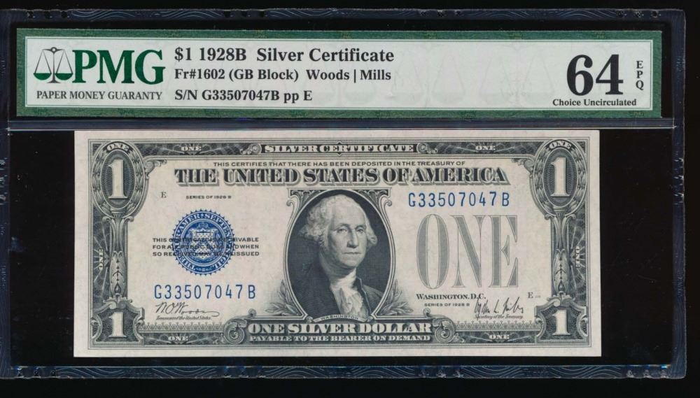 One 1928B $1 Silver Certificate PMG 64EPQ.