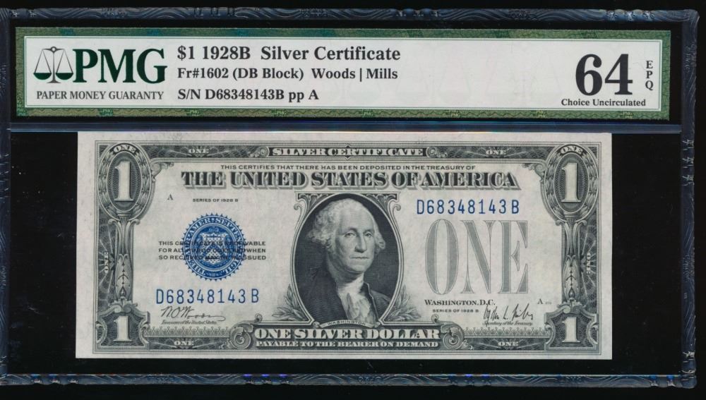One 1928B $1 Silver Certificate PMG 64EPQ.