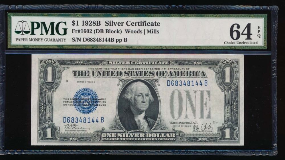 One 1928B $1 Silver Certificate PMG 64EPQ.