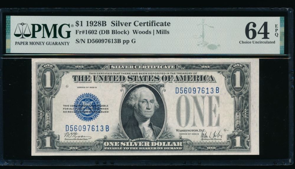 One 1928B $1 Silver Certificate PMG 64EPQ.