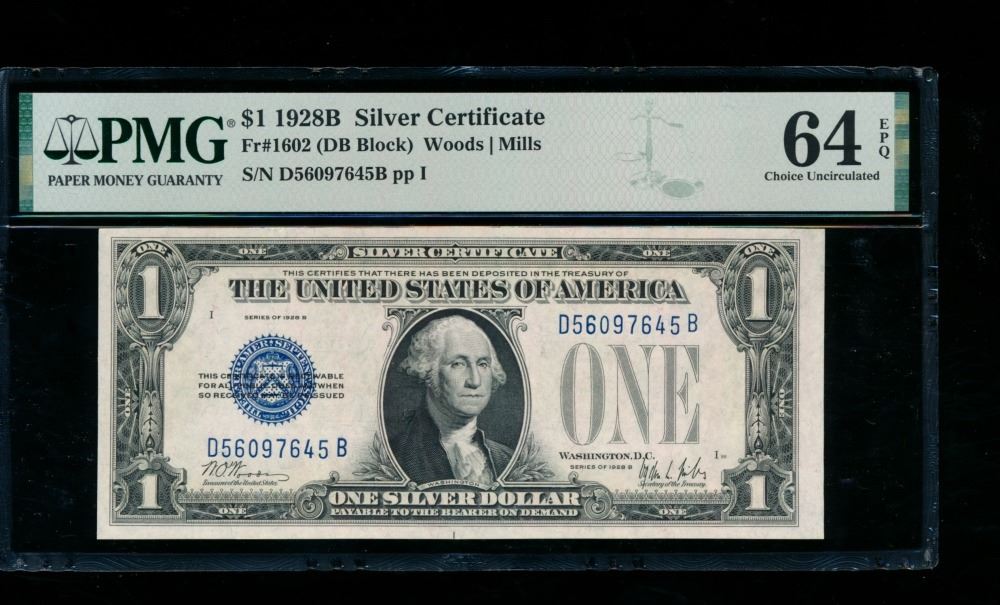 One 1928B $1 Silver Certificate PMG 64EPQ.