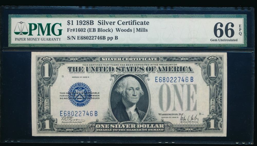One 1928B $1 Silver Certificate PMG 66EPQ.