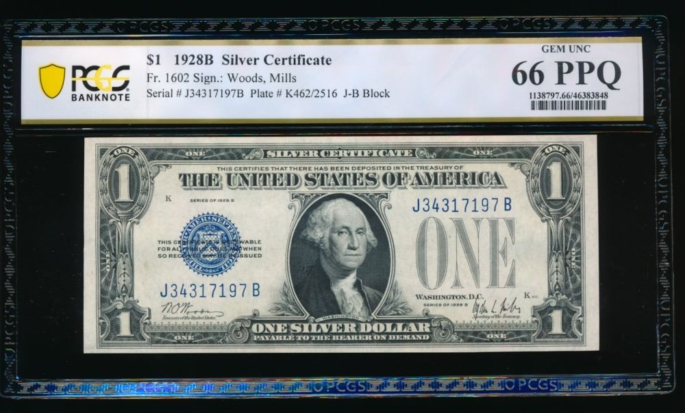 One 1928B $1 Silver Certificate PMG 66EPQ.