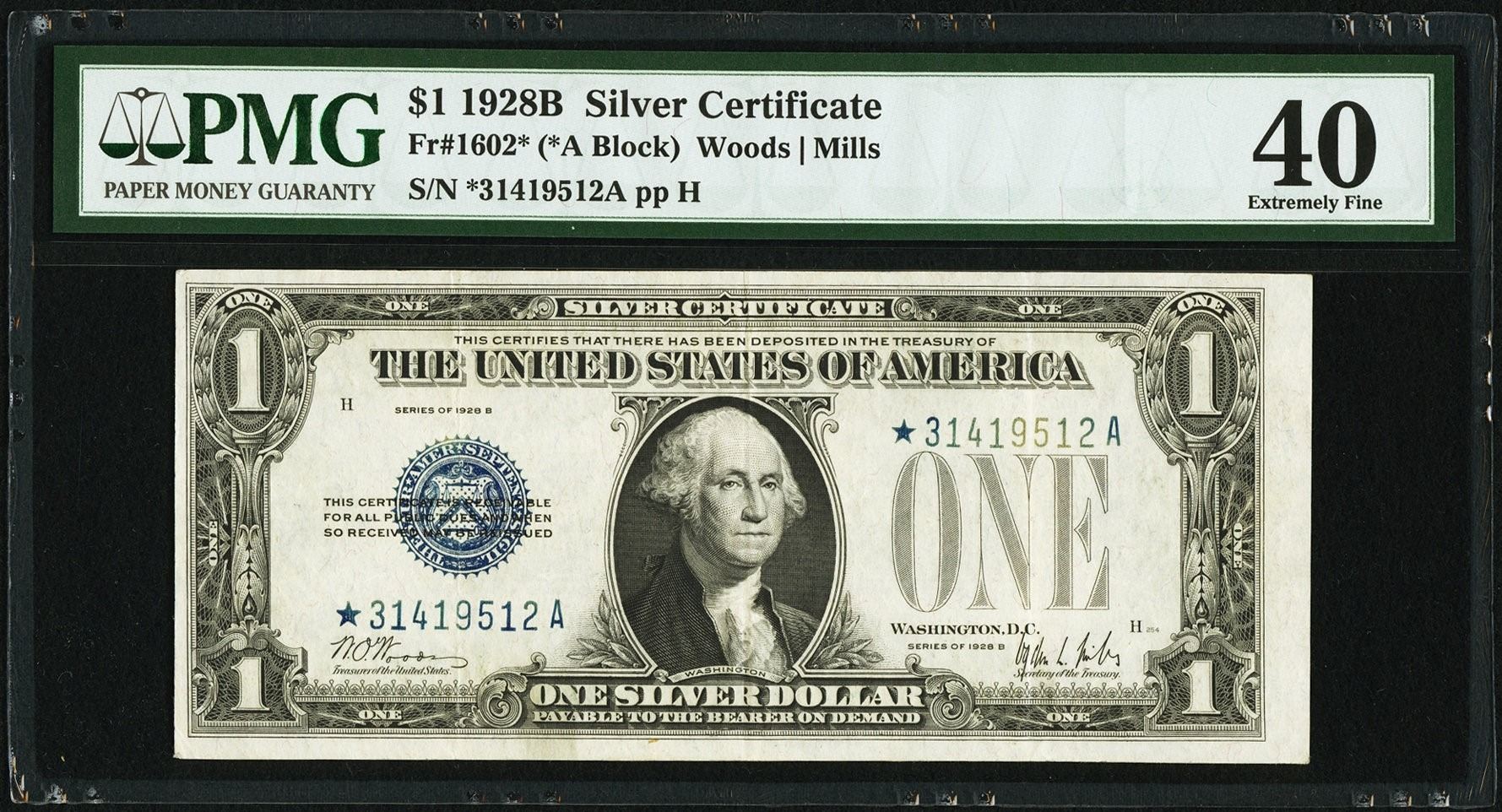 One 1928B $1 Silver Certificate STAR Note PMG 40.