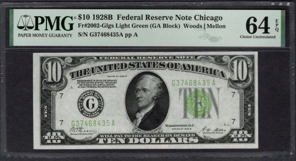 One 1928B $10 Chicago FRN PMG 64EPQ.