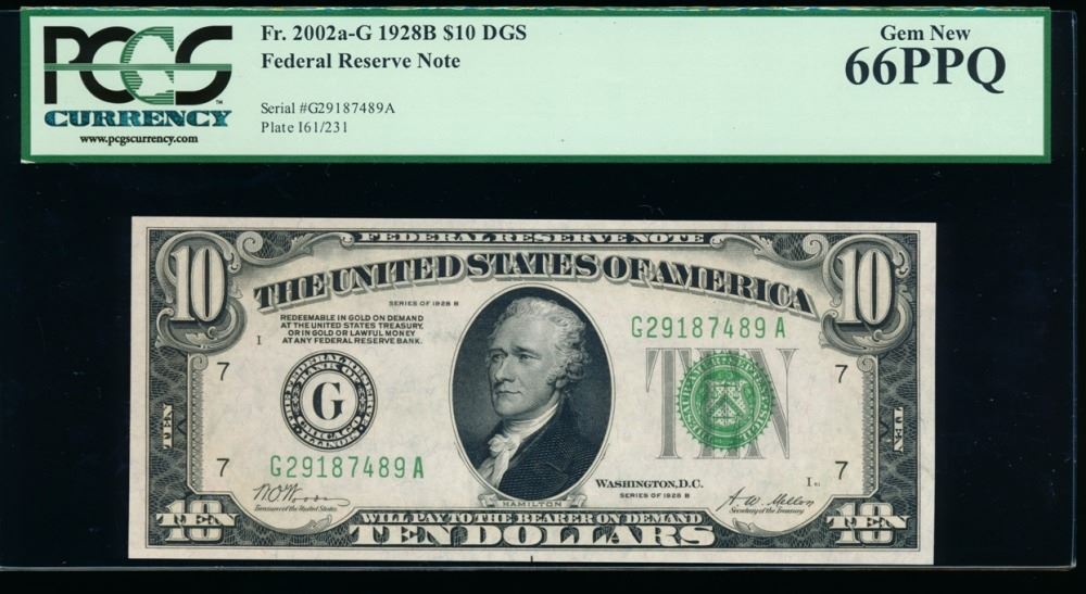 One 1928B $10 Chicago Federal Reserve Note PCGS 66PPQ.