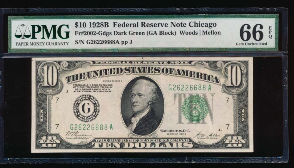 One 1928B $10 Chicago Federal Reserve Note PMG 66EPQ.