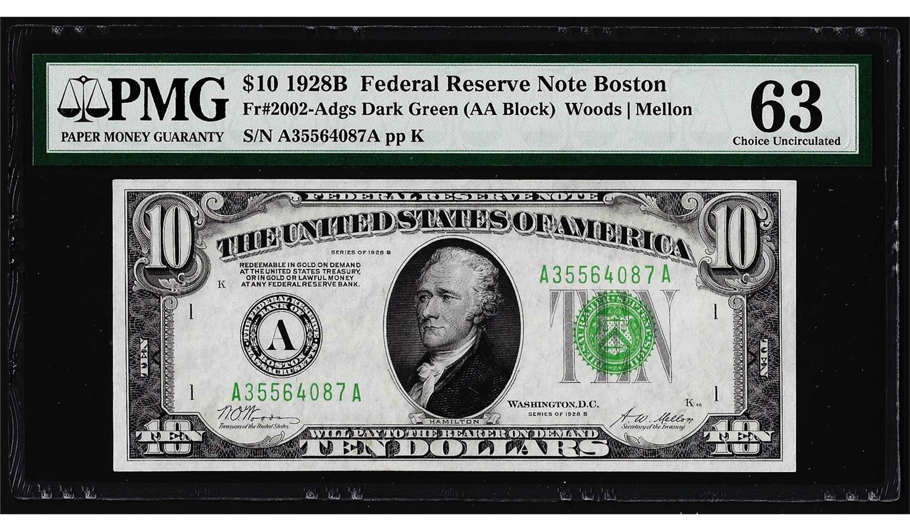 One 1928B $10 Federal Reserve Note Boston Fr.2002-A PMG Choice Uncirculated 63. PMG Certified.