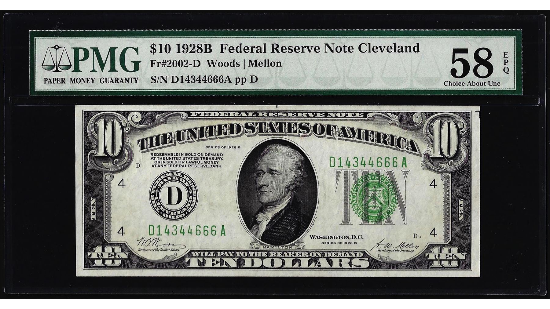 1928B $10 Federal Reserve Note Cleveland Fr.2002-D PMG Choice About Uncirculated 58EPQ