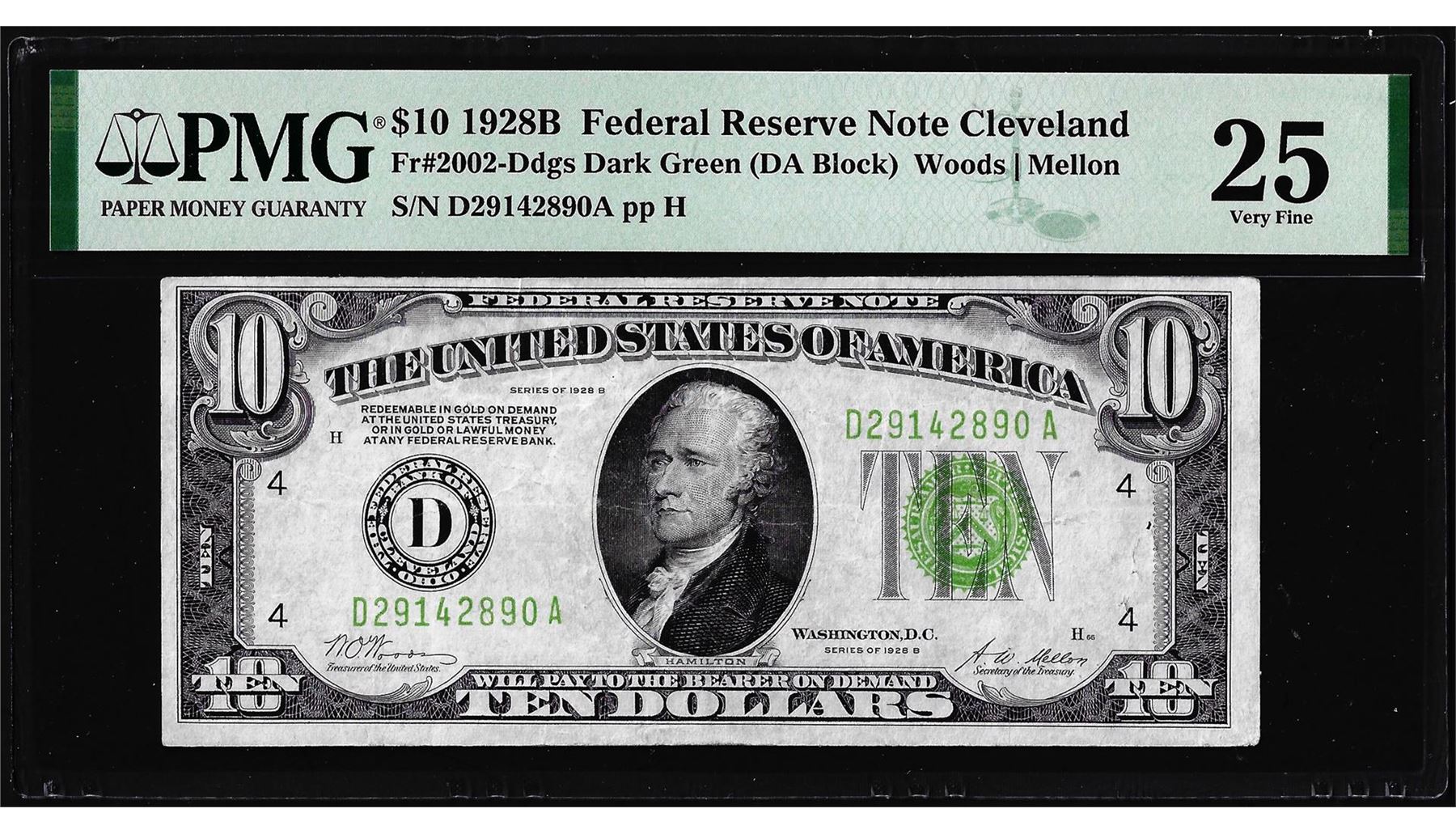 One 1928B $10 Federal Reserve Note Cleveland Fr.2002-D PMG Very Fine 25. PMG Certified.