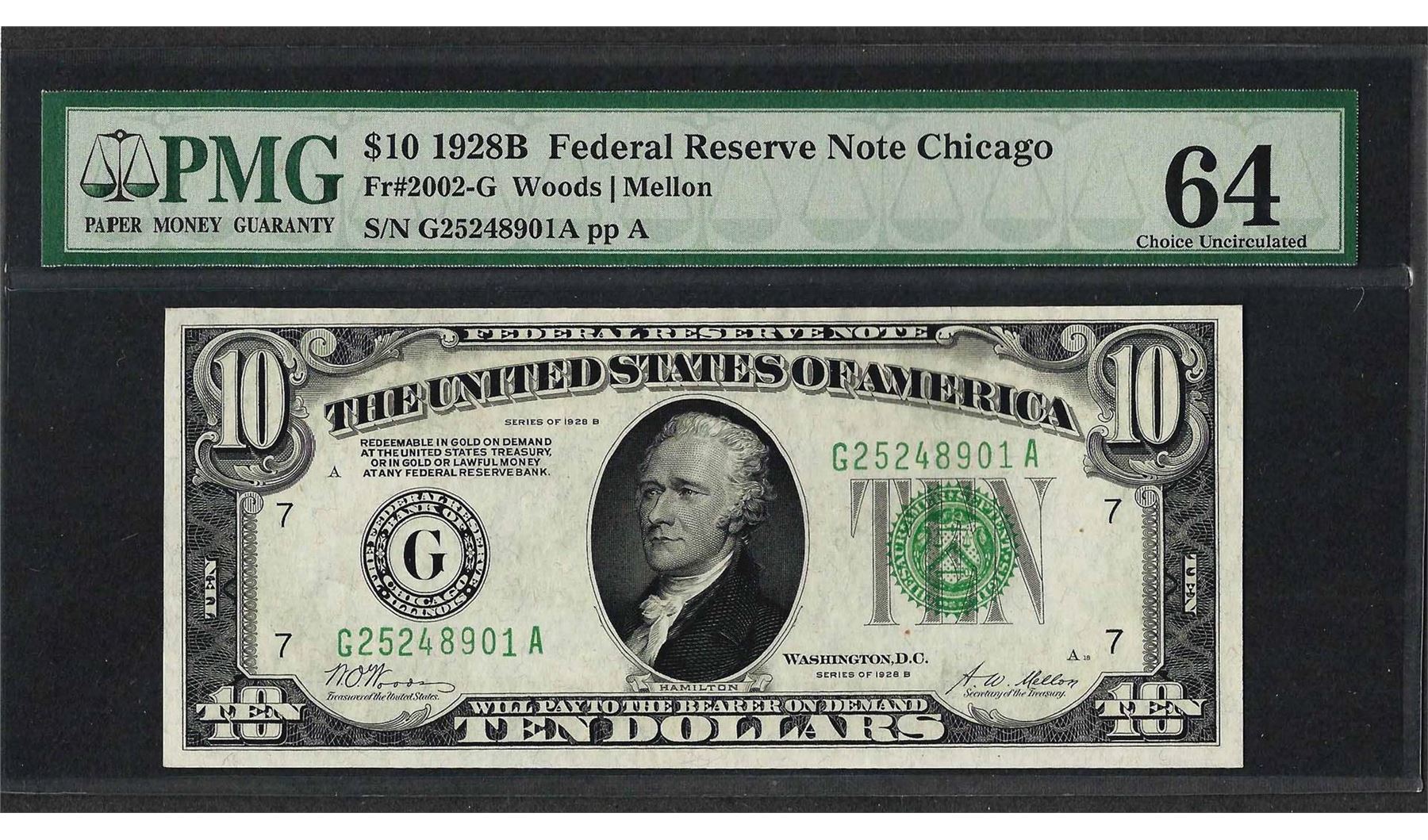 One 1928B $10 Federal Reserve Note Fr.2002-G PMG Choice Uncirculated 64. PMG Certified.