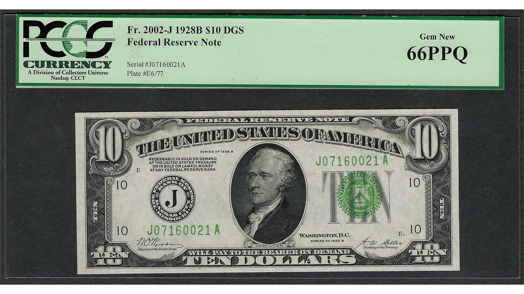 One 1928B $10 Federal Reserve Note Fr.2002-J DGS PCGS Gem New 66PPQ. PCGS Graded.