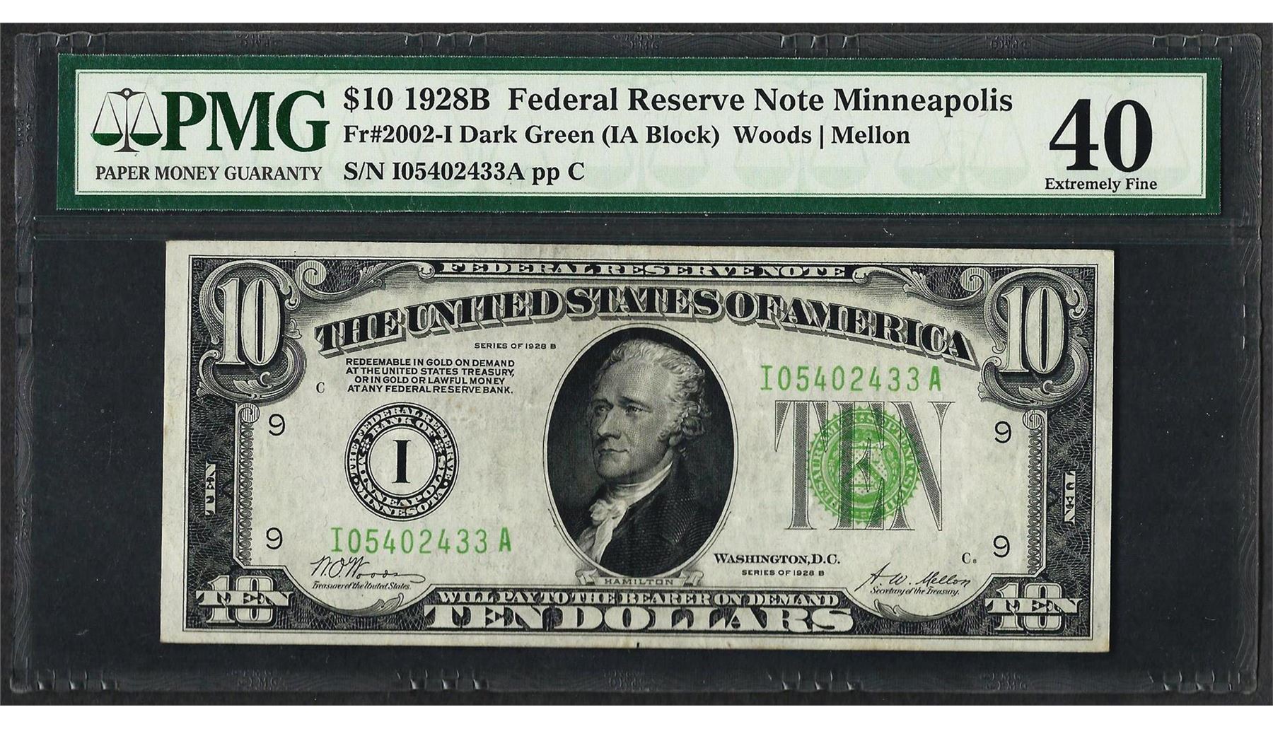 One 1928B $10 Federal Reserve Note Minneapolis Fr.2002-I PMG Extremely Fine 40. PMG Certified.