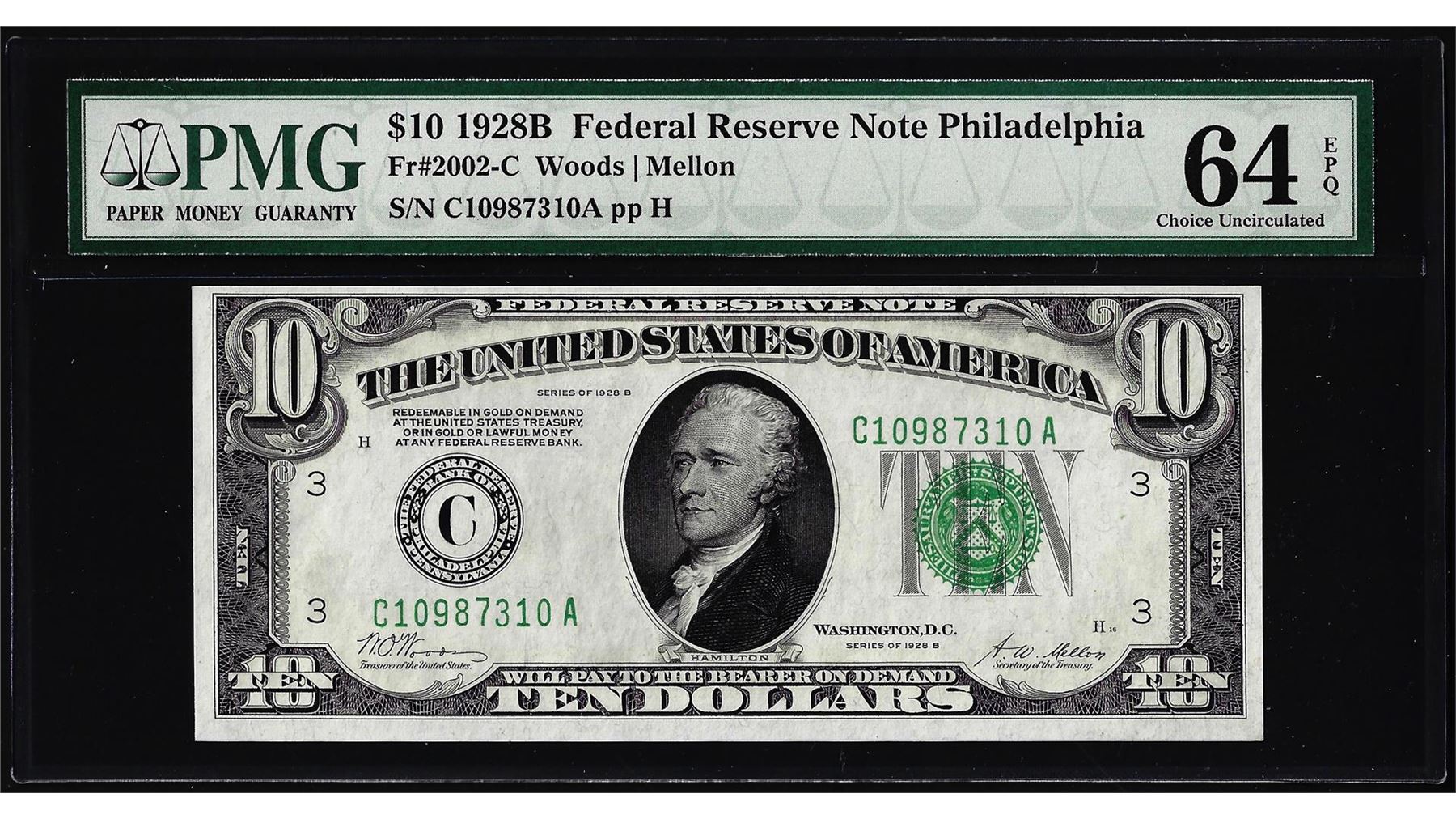 1928B $10 Federal Reserve Note Philadelphia Fr.2002-C PMG Choice Uncirculated 64EPQ