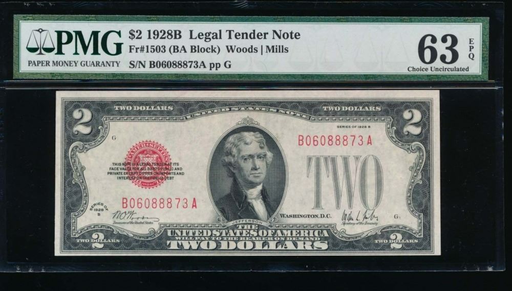 One 1928B $2 Legal Tender Note PMG 63EPQ.