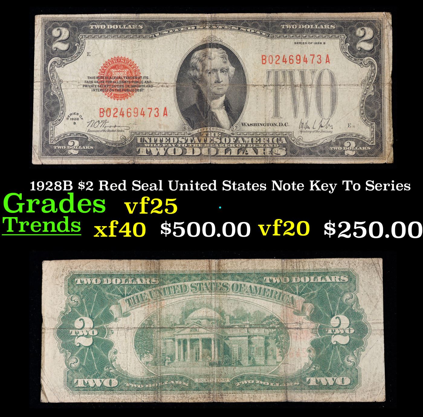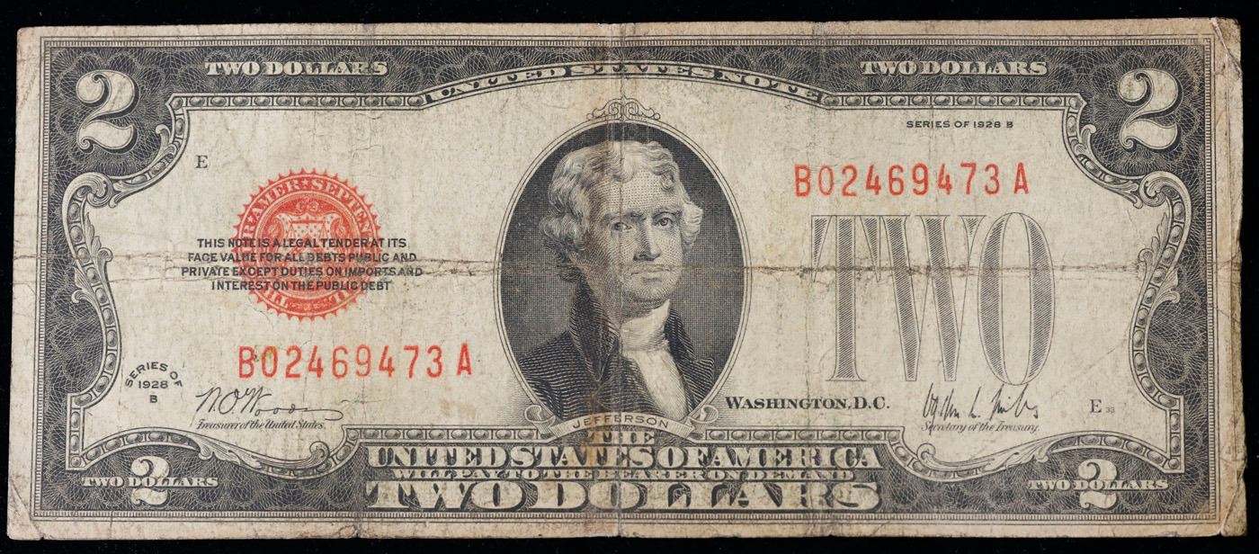 1928B $2 Red Seal United States Note Key To Series Grades vf+. Series of 1928B two dollar red seal legal tender notes are the key to the 1928 $2 series. Only nine million regular issue 1928B two dollar bills were printed Out of about 450 Million 1928 Series $2 Bills. These can be from the AA block, but they are more commonly found in the BA block. Series of 1928B $2 bills were printed between February 1932 and March 1933. These dates coincide with when WO Woods and Ogden L Mills were in office together.