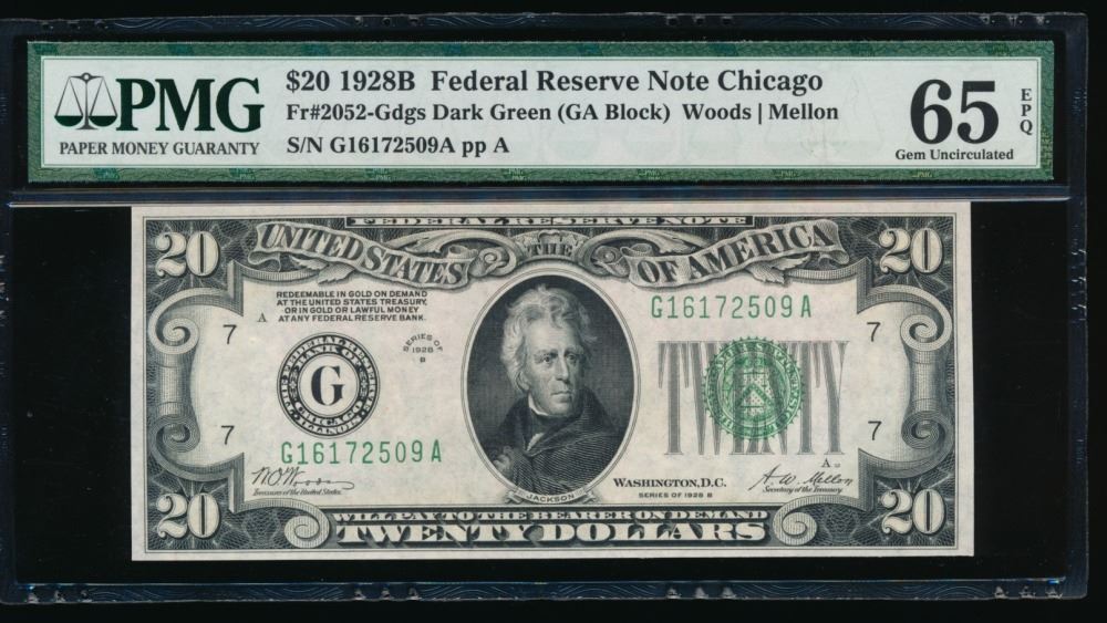 One 1928B $20 Chicago FRN PMG 65EPQ.
