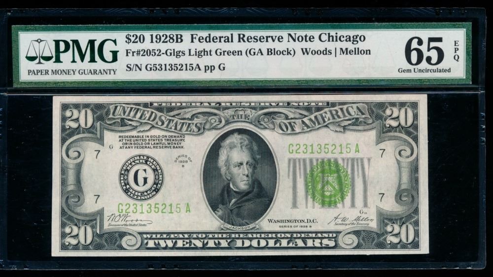 One 1928B $20 Chicago FRN PMG 65EPQ.
