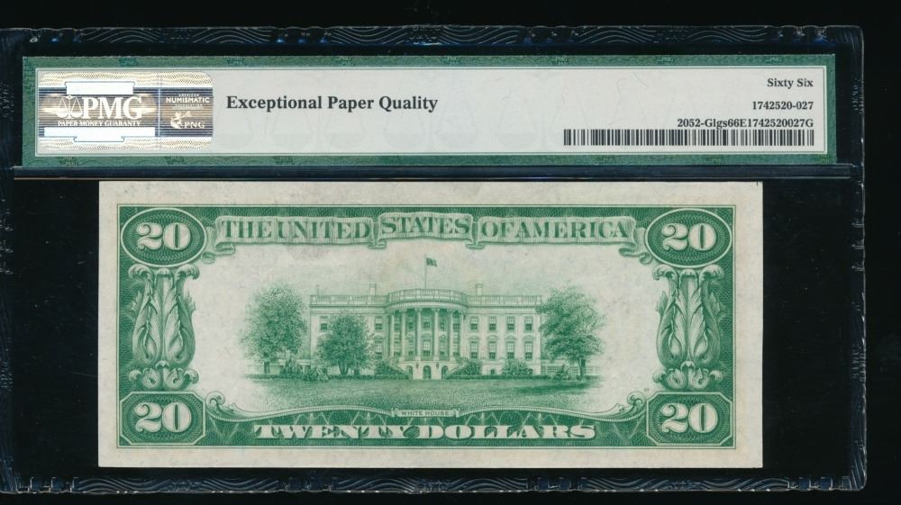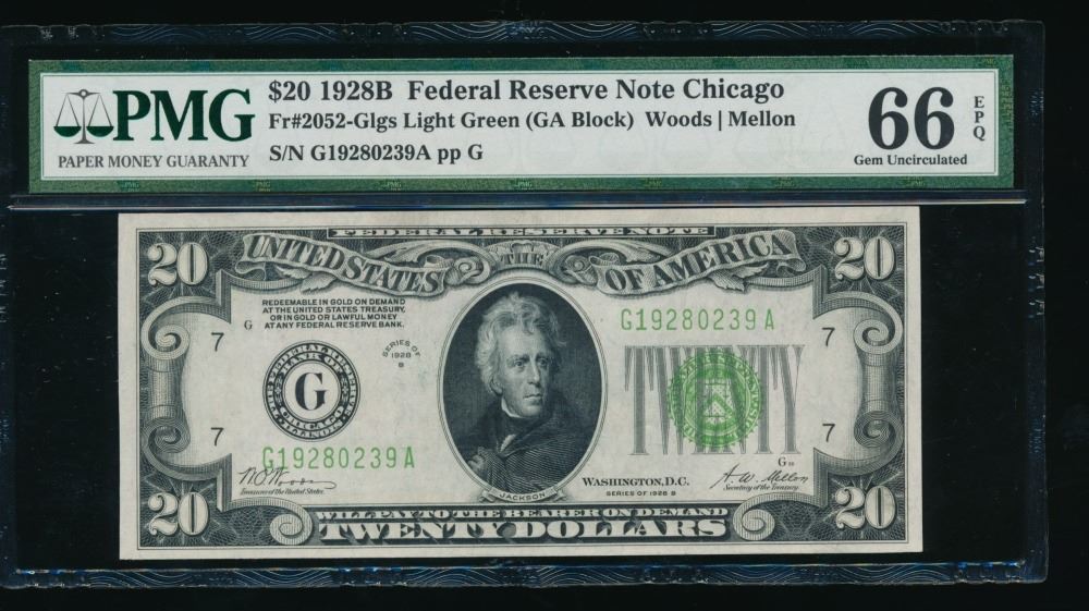 One 1928B $20 Chicago FRN PMG 66EPQ.