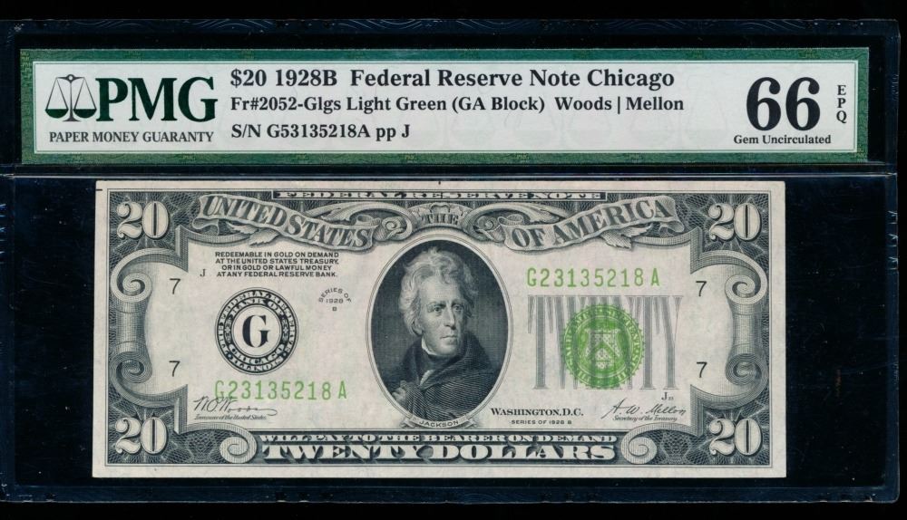 One 1928B $20 Chicago FRN PMG 66EPQ.