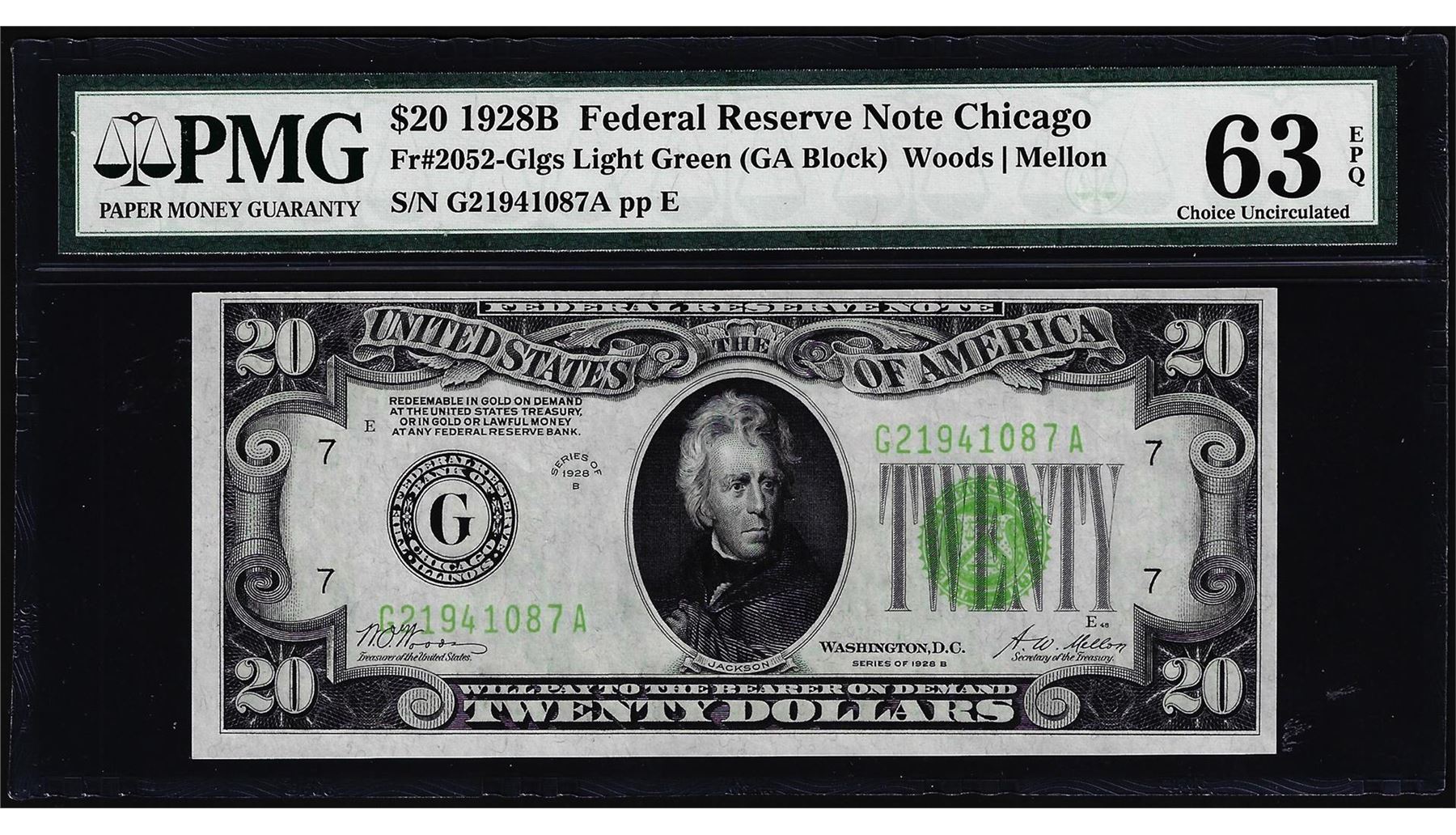 One 1928B $20 Federal Reserve Note Chicago Fr.2052-Glgs Light PMG Ch. Uncirculated 63EPQ. PMG Certified.