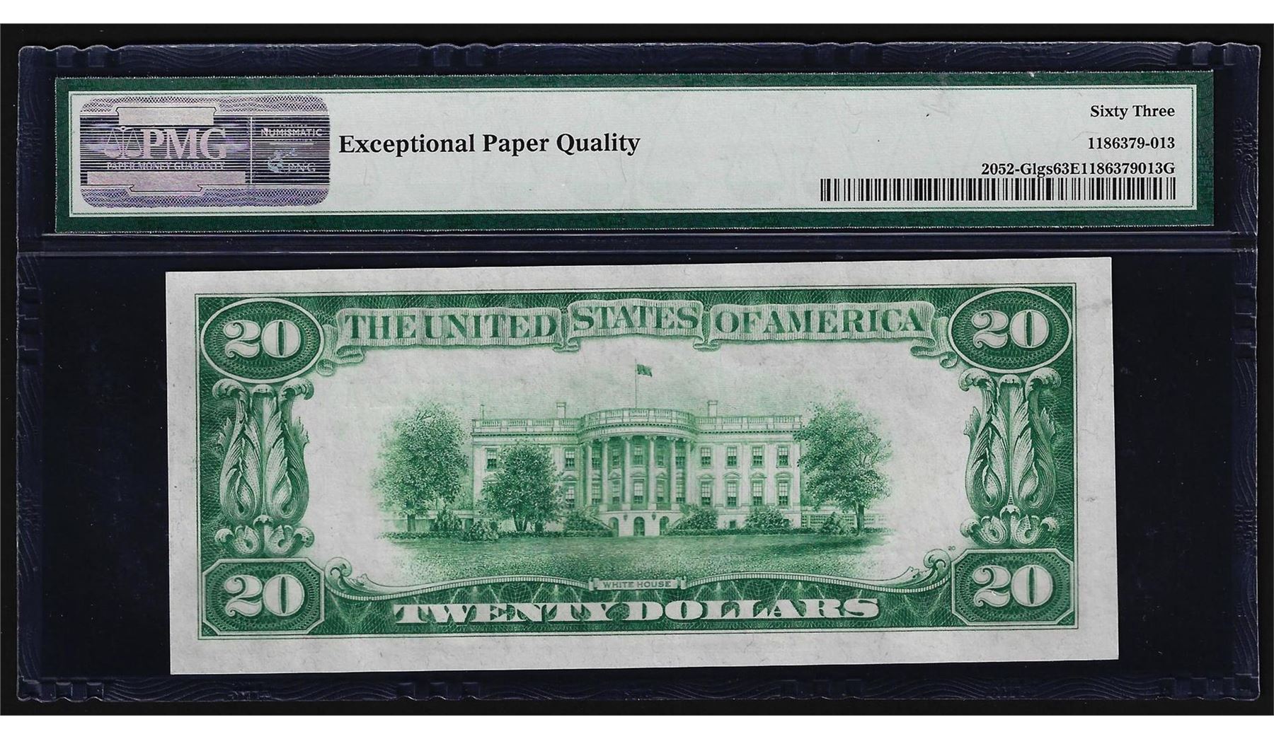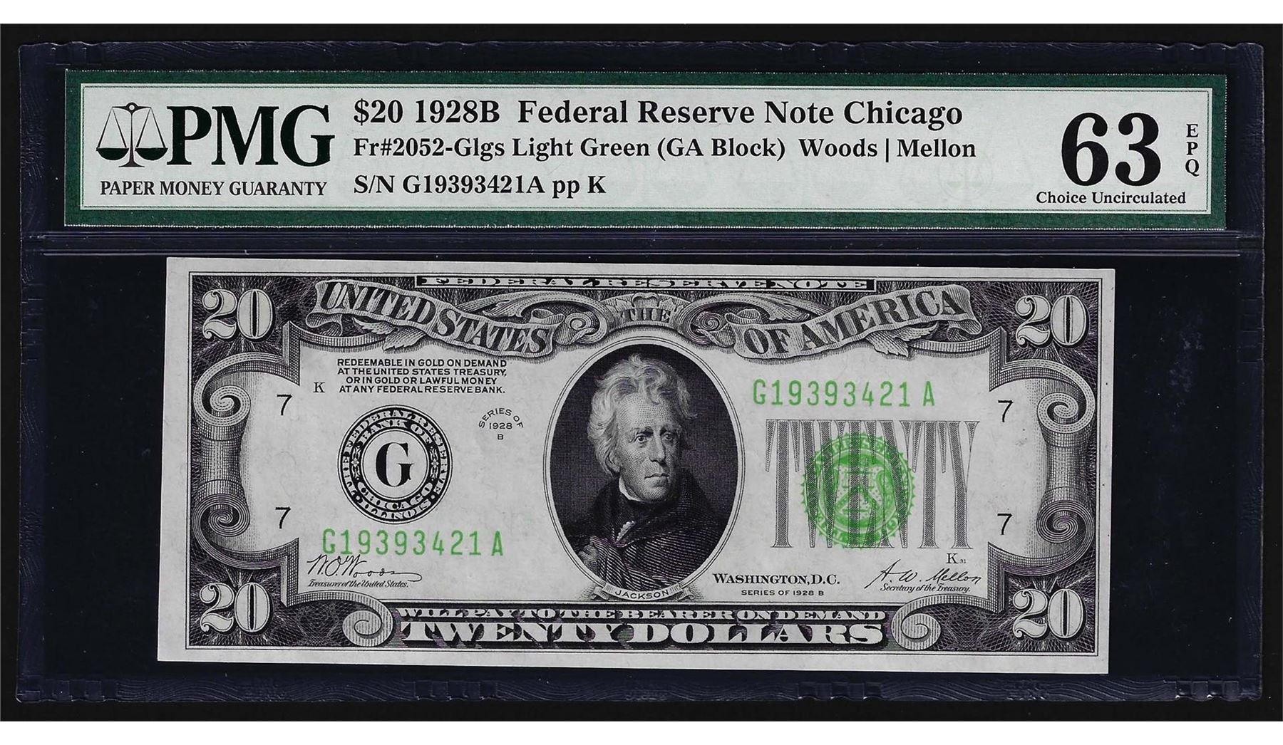 One 1928B $20 Federal Reserve Note Chicago Light Green Seal Choice Uncirculated 63EPQ. PMG Certified.
