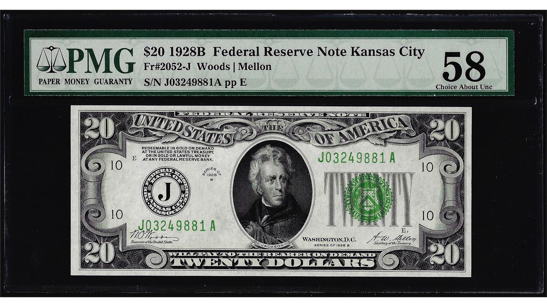 One 1928B $20 Federal Reserve Note Kansas City Fr.2052-J PMG Choice About Uncirculated 58. PMG Certified.