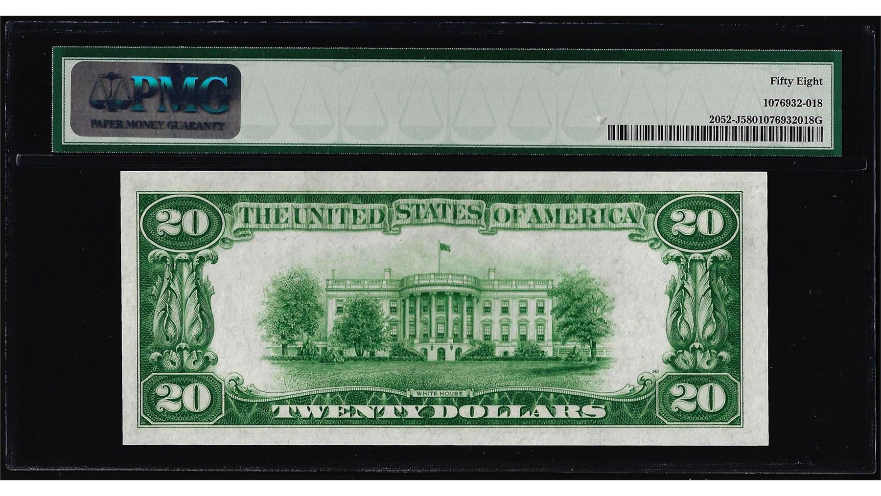 1928B $20 Federal Reserve Note Kansas City Fr.2052-J PMG Choice About Uncirculated 58