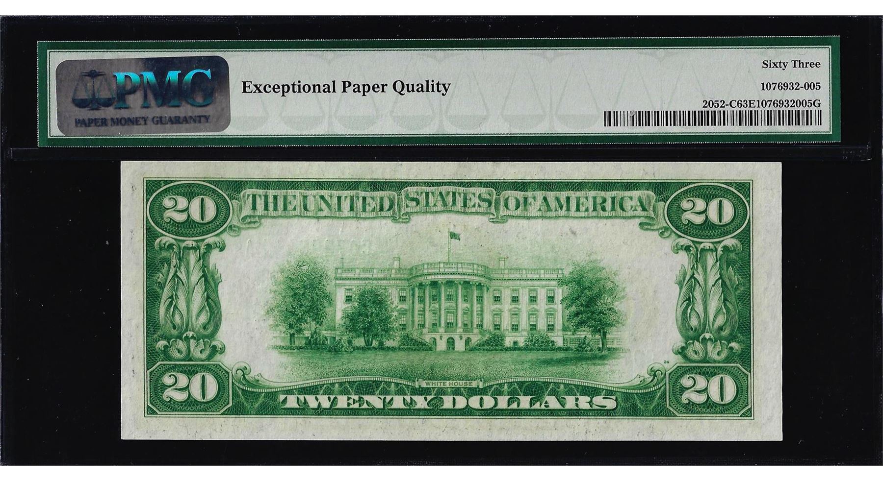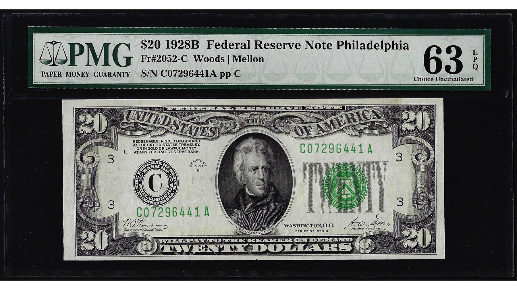 1928B $20 Federal Reserve Note Philadelphia Fr.2052-C PMG Choice Uncirculated 63EPQ