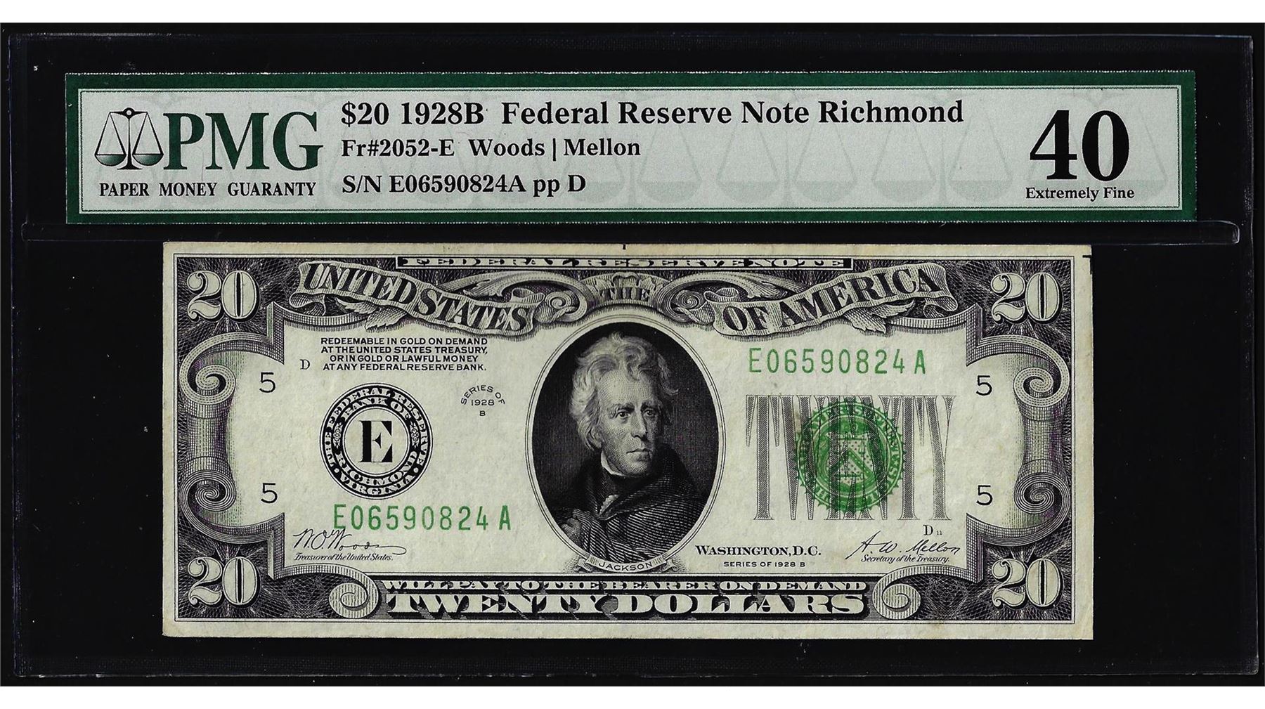 One 1928B $20 Federal Reserve Note Richmond Fr.2052-E PMG Extremely Fine 40. PMG Certified.